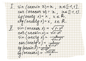 Тригонометрические функции связаны между собой большим количеством формул. Обратные тригонометрические функции чрезвычайно обогащают форменный аппарат тригонометрии, но пользоваться соотношениями, содержащие обратные функции, приходится, на самом деле, не очень часто. Математическая практика указывает, какие формулы заслуживают внимания: 1. Тригонометрическая функция от обратной тригонометрической функции есть алгебраическая функция.