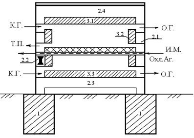 ТР – в объеме которого реализуются все ступени технологического процесса. В реактор подается технологическое сырье или полупродукты, в необходимых случаях – окислитель; подводятся компоненты горения и электроэнергия, используемые для генерации теплоты, обеспечивающей необходимые изменения теплового состояния исходного технического материала. Полученные в реакторе продукты технологического процесса в наиболее общем случаев включают целевой и побочный продукты технического процесса, технические отходы, продукты топочного процесса. Когда глубокое охлаждение продуктов и отходов технического процесса в пределах ТР невозможно или экономически невыгодно, предусматривается их дальнейшее охлаждение в устройствах дополнительного теплоиспользования. Регенеративный подогреватель компонентов горения за счет теплоты отходящих газов (РПКГ)от и устройство внешнего использования теплоты отходящих газов (УВТ)ог. В (РПКГ) теплота отходящих газов передается компонентам горения (топливу и окислителю) и с ними возвращается в ТР, В УВТ теплота утилизируется в теплотехническом процессе температурный уровень которого ниже Тмакст.п. ВТП, реализуемого в ТР (на рисунке они подключены последовательно, но может быть и параллельно). Отходящие газы ВТУ содержат примеси, следовательно, в схему ВТУ включается система аппаратов газоочистки Г.О.. Низкотемпературное включение ГО обеспечивает повышенную эксплуатационную стойкость этих аппаратов и эффективность уравнивания в них примесей, однако при этом аппараты ГО не защищают поверхность теплообмена РПКГ и УВТ от воздействия на них примесей отходящих газов. Отходящие газы, охлажденные в РПКГ и УВТ, очищенные от примесей в аппаратах ГО, выбрасываются в атмосферу через дымовую трубу ДТ, Самотяга ДТ давления дымососа Д обеспечивают преодоление аэродинамического сопротивления элементов структурной схемы, расположенных после ТР. Компоненты горения, основное и дополнительное сырье перед вводом их соответственно в РПКГ, ТР и УВТ обычно проходят целенаправленную подготовку, которая осуществляется в специальных устройствах подготовки компонентов горения УПКГ и исходных материалов УПИМ. Предусматривается также целенаправленная подготовка используемой в ВТУ электроэнергии. Для этого служит ПЭЭ преобразователь электроэнергии. 3.7 Конструктивная схема ТР