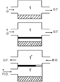 Фундамент 1 воспринимает нагрузку ТТ реактора и находящихся в нем материалов и передает ее на основания естественного грунта. Каркас ТР состоит из колоны (2.1), поперечных связей (2.2), продольных связей (2.3, 2.4). температура всех элементов каркаса должна быть ниже 200 0С. Те элементы, которые не могут быть изолированы от ТР, выполняются полыми, с пропуском через них охлаждающего агента (2.5). каркас служит для восприятия усилий обмуровки, ТР. На каркас крепятся арматура, топливные сжигающие устройства, воздухо и газоводы, площадки обслуживания. Обмуровка состоит из свода (3.1), стен (3.2), подина (3.3). в обмуровке предусматривается ряд отверстий для ввода в рабочее пространство компонентов горения и технического сырья и вывода из него отходящих газов и теплотехнический продукт. Обмуровка обеспечивает герметизацию и теплоизоляцию его от окружающей среды. Трубы 2.5 служат опорой для нагреваемых заготовок и обеспечивает возможность их двустороннего нагрева. 3.8 Классификация ВТУ 1. По отраслевой принадлежности различают: металлургические, ВТУ химической промышленности, ВТУ строительных материалов, ВТУ нефтепереработки… 2. В зависимости от содержания технологических процессов: нагревательные, печи термообработки, обжиговые, линейные, плавильные, рафинировочное. 3. По общности целевого технологического продукта: сталеплавильные, медеплавильные, крекинги нефтепродуктов, стекловарные, газогенераторные. 4. По форме рабочего пространства: камерные, шахтные, туннельные, трубчатые, кольцевые. 5. По принципу работы: непрерывного и периодического действия. В непрерывно действующих ВТУ ввод технологического сырья в реактор и вывод из него всех продуктов осуществляется непрерывно, в едином технологическом ритме. 6. В зависимости от источника теплоты: топливные, электрические, топливно-электрические, автотермические, солнечные ВТУ. В рабочем пространстве каждой ВТУ наряду с ТТ процессом преобразования ИМ в продукты реализуется процесс генерации теплоты, необходимой для изменения теплового состояния ИМ. Часть реактора, где происходит преобразование введенной энергии в теплоту называется зоной генерирования теплоты (ЗГТ). Часть, где осуществляется преобразование ИМ в технологические продукты называется зоной технологического процесса (ЗТП). В зависимости от пространственной совмещенности этих зон различают установки с несовмещенными, совмещенными и частично совмещенными ЗГТ и ЗТП.