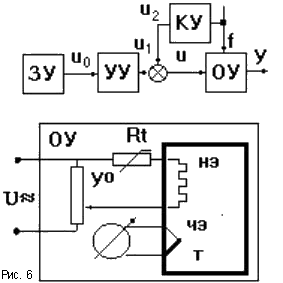 Пусть yо - значение выходной величины, которое требуется обеспечить согласно программе. На самом деле из-за возмущения f на выходе регистрируется значение y. Величина e = yо - y называется отклонением от заданной величины. Если каким-то образом удается измерить величину f, то можно откорректировать управляющее воздействие u на входе ОУ, суммируя сигнал УУ с корректирующим воздействием, пропорциональным возмущению f и компенсирующим его влияние. Примеры систем компенсации: биметаллический маятник в часах, компенсационная обмотка машины постоянного тока и т.п. На рис.6 в цепи НЭ стоит термосопротивление R t, величина которого меняется в зависимости от колебаний температуры окружающей среды, корректируя напряжение на НЭ. Достоинство принципа компенсации: быстрота реакции на возмущения. Он более точен, чем принцип разомкнутого управления. Недостаток: невозможность учета подобным образом всех возможных возмущений.