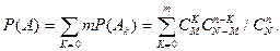 Рассмотрим несколько примеров. Пример 1. В последовательности из N двоичных символов имеется M единиц. При передаче данной последовательности сохраняется n символов, остальные теряются. Какова вероятность того, что среди них будет не более m единиц? Решение. Пусть A - событие, состоящее в том, что среди двоичных символов будет не более m единиц. Событие A произойдет тогда, когда среди n двоичных символов не будет ни одной единицы (событие