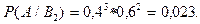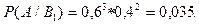 Пример 2. По каналу связи с помехами передается одна из двух команд управления управления в виде кодовых комбинаций 11111 и 00000, вероятности передачи этих команд равны соответственно 0,7 и 0,3. Вероятность правильного приема каждого из символов 0 и 1 равна 0,6. Символы искажаются помехами независимо друг от друга. На выходе канала имеем кодовую комбинацию 10110. Оценить, какая команда была передана. Решение. Пусть A - событие, состоящее в приеме комбинации 10110. Это событие может произойти только в совокупности с одним из событий: Условная вероятность приема комбинации 10110 при условии, что передавалась команда 11111 равна