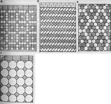 Рис. 24. Малюнки підлог з керамічних плиток а — квадратних; б — прямокутних; в — шестигранних; г — восьмигранних.