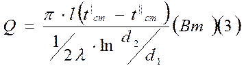 Где Q - количество тепла, определяемое по мощности электрического нагревателя; l - длинна трубы, м; d1 и d2 - внутренний и наружный диаметры изоляции, м; t|сm и t||сm - температура внутренней и наружной поверхности изоляции в оС.