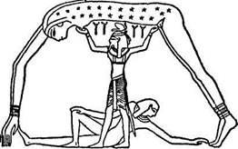 Рис. 14 Отделение Неба от Земли Один за другим братья – боги пытались развести небо и землю, но напрасно Наконец, сам Тане – махута, отец лесов и созданий, обитающих в них, а также тех, что сделаны из дерева, успешно справился с титаническим замыслом. «Его голова теперь твердо упиралась в землю – мать, свои ноги он вытянул вверх, упираясь ими в небо – отца, затем он напряг свою спину и огромным усилием разделил их. Теперь разделенные Ранги и Папа с криками и стенаниями запричитали: ‘Почему вы совершаете столь ужасное преступление, разделяя нас, ваших родителей, и убивая нас?’ Но Тане – махута не останавливался, не внимая их стонам и крикам; все дальше и дальше вниз толкал он землю, все дальше и дальше вверх толкал он небо...»43. В том виде, как ее представляли древние греки, эта история изложена Гесиодом в его описании отделения Урана (Отца – Неба) от Геи (Матери – Земли). Согласно этому варианту, титан Хронос оскопил своего отца серпом и таким образом убрал его со своей дороги44. В египетской иконографии расположение космической четы обратное: небо является матерью, отец же воплощает жизненные силы земли45; но мифологический шаблон не меняется: двое разлучаются своим дитям, богом воздуха Шу. И снова все тот же образ приходит к нам из древнего клинописного текста шумеров, датированного III или IV тысячелетием до н. э. Вначале был первичный океан; первичный океан порождает космическую гору, которая состоит из слитых воедино неба и земли; Ан (Небо – Отец) и Ки (Земля – Мать) породили Энлиля (Бога Воздуха), который вскоре отделил Ан от Ки и затем сам соединился со своей матерью, породив человечество46. Но если эти поступки отчаявшихся детей и представляются насилием, они – просто ничто по сравнению с тотальной расправой над родительской силой, которую мы обнаруживаем в исландской Эдде и в вавилонских Скрижалях Творения. Последний удар – характеристика демиургического присутствия бездны как «зла», «тьмы» и «грязи». Блестящие юные воины – сыновья, теперь презирающие породившего их, – персонификацию зародышевого состояния погруженности в глубочайший сон, – без долгих колебаний убивают его, раздирают и расщепляют на куски и создают из них структуру мира. Это – образец победы, к которому восходят все наши позднейшие состязания с драконом, начало долговековой истории подвигов героя. Согласно Эддам, после того, как разверзся «зияющий разрыв»47, на севере возник туманный мир холода, а на юге – область огня, а затем жар с юга растопил реки из льда, которые тянулись с севера, и начал испаряться клубящийся яд. Из него возник дождь, который, сгустился в иней. Иней таял и капал; жизнь пробуждалась от этих капель – гигантская, вялая, бесполая, горизонтально распластанная фигура, названная Имир. Гигант спал, и во сне он потел; одна из его ног вместе с другой породили сына, в то время как под его левой рукой зародились мужчина и женщина. Иней таял и капал, и из него конденсировалась корова, Аудум – ла. Из ее вымени текли четыре потока молока, которые питали жизнь Имира. Корова же питалась тем, что лизала соленые ледяные глыбы. Вечером первого дня из глыбы, которую она лизала, появились волосы человека; на второй день – голова человека; на третий появился весь человек, и имя его было Бури. Далее, у Бури был сын (мать неизвестна), названный Борр, который женился на одной и