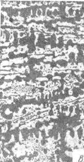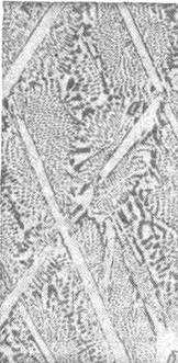 а б в Рис. 4.1. Микроструктура белых чугунов, × 200: а – доэвтектический (ледебурит, перлит + вторичный цементит); б – эвтектический (ледебурит); в – заэвтектический (ледебурит + первичный цементит)