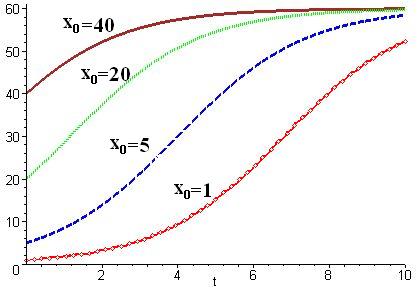 Рис. 2.2. Изменение численности особей при: А) ε =const= 0,4, х0=const=10; Б) δ=const=0,001; х0=const= 10; В) δ=const=0,01; ε =const=0,6.