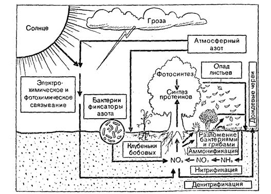 В водной среде фиксацию атмосферного азота осуществляют цианобактерии. Синтезированные белки растений (а в водной среде - бактерий) служат основой азотного питания животных. Экскреты животных и мертвые организмы (детрит) составляют базу азотного питания детритофагов и редуцентов. Детритофаги из органических азотсодержащих веществ синтезируют органические азотсодержащие вещества своего тела. Редуценты разлагают органические азотсодержащие соединения с постепенным превращением в неорганические вещества. Конечным звеном этой редукционной цепи являются аммонифицирующие организмы, образующие аммиак (NH3). Этот аммиак затем может войти в цикл нитрификации, в котором нитрифицирующие бактерии окисляют его в нитриты и затем в нитраты. Часть этих нитратов и нитритов усваивается растениями через корневую систему. Вторая часть под действием бактерий – денитрификаторов разлагается с образованием азота (N2), который возвращается в атмосферу (рис.2).
