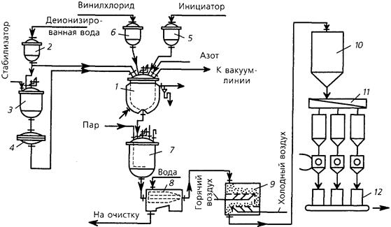 Суспензию образовавшегося полимера передают в сборник-усреднитель 7, в котором ее смешивают с другими партиями, охлаждают и сливают в центрифугу непрерывного действия 8 для отделения полимера от водной фазы и промывки его водой. Промывные воды поступают в систему очистки сточных вод. Порошок с влажностью 25-35 % подается в сушилку 9, где его сушат горячим воздухом при 80-120 °С до содержания влаги 0,3-0,5 %. Затем порошок сжатым воздухом передают в бункер 10, а из него в узел рассева 11. Полученный порошок упаковывается, а непросеянная крупная фракция поступает на дополнительный размол. В последнее двадцатилетие ведущие западные разработчики технологии ПВХ и компонентов для его производства провели широкие исследовательские и поисковые работы, направленные на интенсификацию полимеризационного процесса и снижение материальных и энергетических затрат, что позволило значительно удешевить создание новых установок. Все эти достижения были реализованы в значительной степени за счет применения новых компонентов рецептурного формата технологии, включающего следующие агенты: - эмульгирующая система на основе первичного и вторичного поливиниловых спиртов и (часто) эфиров целлюлозы, позволяющая осуществлять полимеризационный процесс по так называемому «горячему» методу загрузки реактора; - инициирующая система на основе пероксидикарбонатов и несимметричных пероксиэфиров, обеспечивающая равномерное тепловыделение в реакторе и возможность максимального использования поверхности теплосъема реактора; - антикоркообразователь в реакторе, позволяющий проводить до 500 операций полимеризации без вскрытия реактора для чистки внутренней поверхности от наростов полимера; - антивспениватель в реакторе, обеспечивающий предотвращение образования «сухой» пены в реакторе и тем самым коркообразование на верхней сфере реактора и в обратном конденсаторе; - ингибитор полимеризации и стоппер аварийных ситуаций; - пеногаситель на дегазации; - ингибитор на стадии рекуперации мономера.