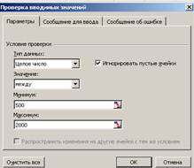Щоб запобігти помилковому введенню даних, за допомогою команди Данные/Проверка визначають параметри контролю для виділених клітинок або діапазонів (мал.19).