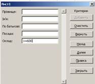 Форма даних дає змогу додавати нові та вилучати активні записи, зручно та наочно коригувати наявні дані. Переміщатися за записами бази можна за допомогою вертикальної смуги прокрутки, а для переходу до потрібного поля, крім мишки, використовують клавішу Tab. Натиснувши на кнопку Критерии,можна задати критерії відбору записів за значеннями конкретних полів або заданими умовами з використанням операцій порівняння =, <, >, <=, >=, <>) (мал.21). Після цього кнопки Назад та Далее відображатимуть лише ті записи, які задовольняють вказаному критерію (вийти з цього режиму можна, натиснувши на кнопку Правка).