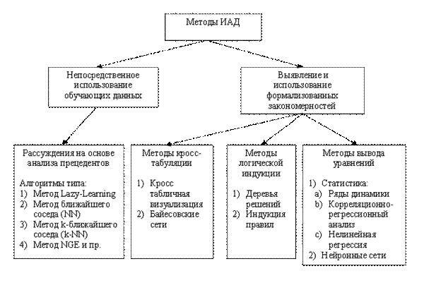 Рис. 5.4 Классификация технологических методов ИАД 1. Непосредственное использование обучающих данных Обобщенный алгоритм Lazy-Learning, относящийся к рассматриваемой группе, выглядит так: на вход классификатора подается пример, на выходе ожидается предсказание включающего его класса. Каждый пример представляется точкой в многомерном пространстве свойств (атрибутов), принадлежащей некоторому классу. Каждый атрибут принимает непрерывные значения либо дискретные значения из фиксированного набора. Для примера возвращается его наиболее вероятный класс. Особенность этой группы методов состоит в том, что предсказание неизвестных значений выполняется на основе явного сравнения нового объекта (примера) с известными примерами. В случае большого количества обучающих примеров, чтобы не сканировать последовательно все обучающее множество для классификации каждого нового примера, иногда используется прием выборки относительно небольшого подмножества "типичных представителей" обучающих примеров, на основе сравнения с которыми и выполняется классификация. Однако, этим приемом следует пользоваться с известной осторожностью, так как в выделенном подмножестве могут не быть отражены некоторые существенные закономерности. Что касается самого известного представителя этой группы - метода k-ближайшего соседа, - он более приспособлен к тем предметным областям, где атрибуты объектов имеют преимущественно численный формат, так как определение расстояния между примерами в этом случае является более естественным, чем для дискретных атрибутов. 2. Выявление и использование формализованных закономерностей Методы этой группы извлекают общие зависимости из множества данных и позволяют затем применять их на практике. Они отличаются друг от друга: · по типам извлекаемой информации (которые определяются решаемой задачей); · по способу представления найденных закономерностей. Формализм, выбранный для выражения закономерностей, позволяет выделить три различных подхода, каждый из которых уходит своими корнями в соответствующие разделы математики: · методы кросс-табуляции; · методы логической индукции; · методы вывода уравнений. Логические методы наиболее универсальны в том смысле, что могут работать как с численными, так и с другими типами атрибутов. Построение уравнений требует приведения всех атрибутов к численному виду, тогда как кросс-табуляция, напротив, требует преобразования каждого численного атрибута в дискретное множество интервалов. Методы кросс-табуляции Кросс-табуляция является простой формой анализа, широко используемой в генерации отчетов средствами систем оперативной аналитической обработки (OLAP). Двумерная кросс-таблица представляет собой матрицу значений, каждая ячейка которой лежит на пересечении значений атрибутов. Расширение идеи кросс-табличного представления на случай гиперкубической информационной модели является, как уже говорилось, основой многомерного анализа данных, поэтому эта группа методов может рассматриваться как симбиоз многомерного оперативного анализа и интеллектуального анализа данных. Кросс-табличная визуализация является наиболее простым воплощением идеи поиска информации в данных методом кросс-табуляции. Строго говоря, этот метод не совсем подходит под отмеченное свойство ИАД - пе