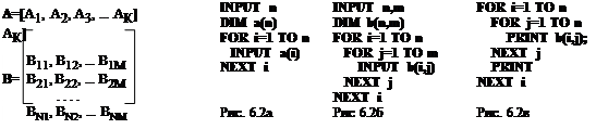 Оператор описания массивов. Если предполагается работа с массивами, предварительно следует “известить” об этом компьютер оператором вида üDIM список_массивов Описание массива содержит имя массива и его размерность. Например, оператор DIM A(20), B(4,6) читается как “Установить размерность одномерного массива A из 20 элементов и двумерного массива В из 24–х элементов (4 строки, 6 столбцов)”. По умолчанию отсчет элементов в Бейсике начинается с нуля, то есть оператор DIM A(20) определяет на самом деле 21 элемент памяти (нулевой элемент можно игнорировать). Если есть необходимость установить нестандартную нумерацию, можно при определении размерности использовать указатель вида нижняя граница индекса ТО верхняя граница. Например, оператор DIM Y(5 TO 20, 1 TO 8) определяет двухмерный массив Y, у которого первый индекс изменяется от 5 до 20, а второй – от 1 до 8. Размерность массива задается исходя из условий решаемой задачи. Первоочередной задачей при работе с массивами является ввод-вывод данных, который организуется с помощью циклов. На рис. 6а осуществляется ввод данных в вектор A размерностью N элементов. На рис. 6б – в матрицу В размерностью N строк на M столбцов. Ввод осуществляется с помощью двух циклов, один из которых вложен в другой. В наружном цикле изменяется первый индекс I элемента матрицы В, во внутреннем – второй индекс J. Таким образом, второй индекс J изменяется быстрее, чем первый. Это означает, что ввод элементов матрицы будет производиться в следующей последовательности: B(1,1), B(1,2),..., B(1,M); B(2,1), B(2,2),..., B(2,M);...; B(N,1), B(N,2),... B(N,M), т.е. по строкам. Замечание. Два последних оператора могут быть объединены в один вида NEXT j,i (первым должен быть указан индекс внутреннего цикла, вторым – внешнего). Аналогичным образом осуществляется и вывод (рис. 6в), но вместо оператора INPUT используется оператор PRINT. Здесь, однако, следует позаботиться об удобстве восприятия выводимых данных. Желательно, чтобы строка матрицы занимала на экране именно одну строку. Для этого во внутреннем цикле печати нужно поставить точку с запятой после оператора вывода (PRINT;), что подавляет переход на новую строку монитора после вывода каждого числа. Напротив, после завершения вывода всех элементов строки матрицы, как раз следует перейти на следующую строку монитора. Для этого ниже оператора NEXT j следует поставить пустой оператор PRINT, который переведет вывод на следующую строку экрана. Кроме того, для обеспечения фиксированного расположения элементов матрицы друг под другом в столбцы, имеет смысл использовать для вывода не оператор PRINT, а PRINT USING (например, PRINT USING " ####.## "; b(i,j);).