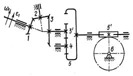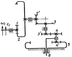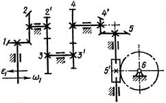 Задача Т1 В зубчатой передаче, показанных на схемах (рис. 9 – 18), входное колесо 1 в данный момент имеет угловую скорость 1) передаточное отношение между входным и выходным звеньями и его знак (если их оси вращения параллельны); 2) угловую скорость и угловое ускорение выходного звена, их направления показать на схеме передачи; 3) время, в течение которого угловая скорость увеличится в два раза (если движение ускоренное), или уменьшится до нуля (если движение замедленное); 4) общий коэффициент полезного действия передачи. В таблице заданных величин z – число зубьев колес приводится с индексом, соответствующим их номеру на схеме механизма, для червяка 1; 2; 3 г – число заходов, а направление витков червяка указано буквами: л – левое, п – правое. Для расчетов принять следующие значения коэффициента полезного действия (учитывающего потери и в зацеплении и в подшипниках): для пары цилиндрических колес