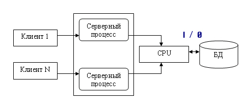 В период создания первых СУБД технология «клиент-сервер» только зарождалась (содержание данного пункта скопировано из работы [19]). Поэтому изначально в архитектуре систем не было адекватного механизма организации взаимодействия процессов типа «клиент» и процессов типа «сервер». В современных же СУБД он является фактически основополагающим и от эффективности его реализации зависит эффективность работы системы в целом. Рассмотрим эволюцию типов организации подобных механизмов. В основном этот механизм определяется структурой реализации серверных процессов, и часто он называется архитектурой сервера баз данных. Первоначально, как мы уже отмечали, существовала модель, когда управление данными (функция сервера) и взаимодействие с пользователем были совмещены в одной программе. Это можно назвать нулевым этапом развития серверов БД. Затем функции управления данными были выделены в самостоятельную группу — сервер, однако модель взаимодействия пользователя с сервером соответствовала парадигме «один-к-одному» (рис. 1.4.2.7.1), то есть сервер обслуживал запросы только одного пользователя (клиента), и для обслуживания нескольких клиентов нужно было запустить эквивалентное число серверов. Выделение сервера в отдельную программу было революционным шагом, который позволил, в частности, поместить сервер на одну машину, а программный интерфейс с пользователем — на другую, осуществляя взаимодействие между ними по сети. Однако необходимость запуска большого числа серверов для обслуживания множества пользователей сильно ограничивала возможности такой системы. Для обслуживания большого числа клиентов на сервере должно быть запущено большое количество одновременно работающих серверных процессов, а это резко повышало требования к ресурсам ЭВМ, на которой запускались все серверные процессы. Кроме того, каждый серверный процесс в этой модели запускался как независимый, поэтому если один клиент сформировал запрос, который был только что выполнен другим серверным процессом для другого клиента, то запрос тем не менее выполнялся повторно. В такой модели весьма сложно обеспечить взаимодействие серверных процессов. Эта модель самая простая, и исторически она появилась первой.