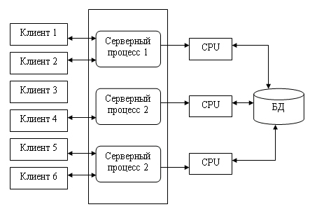 Рисунок 1.4.2.7.3 - Архитектура с виртуальным сервером Подобная организация взаимодействия клиент-сервер может рассматриваться как аналог банка, где имеется несколько окон кассиров, и специальный банковский служащий – администратор зала (диспетчер) направляет каждого вновь пришедшего посетителя (клиента) к свободному кассиру (актуальному серверу). Система работает нормально, пока все посетители равноправны (имеют равные приоритеты), однако стоит лишь появиться посетителям с высшим приоритетом, которые должны обслуживаться в специальном окне, как возникают проблемы. Учет приоритета клиентов особенно важен в системах оперативной обработки транзакций, однако именно эту возможность не может предоставить архитектура систем с диспетчеризацией. Современное решение проблемы СУБД для мультипроцессорных платформ заключается в возможности запуска нескольких серверов базы данных, в том числе и на различных процессорах. При этом каждый из серверов должен быть многопотоковым. Если эти два условия выполнены, то есть основания говорить о многопотоковой архитектуре с несколькими серверами, представленной на рис. 14.2.7.4. Она также может быть названа многонитевой мультисерверной архитектурой. Эта архитектура связана с вопросами распараллеливания выполнения одного пользовательского запроса несколькими серверными процессами.