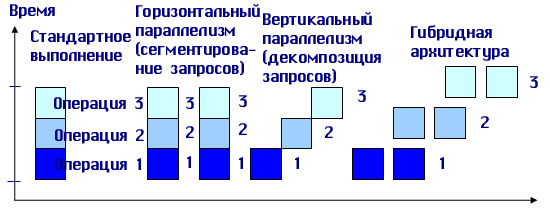 Существует несколько возможностей распараллеливания выполнения запроса. В этом случае пользовательский запрос разбивается на ряд подзапросов, которые могут выполняться параллельно, а результаты их выполнения потом объединяются в общий результат выполнения запроса. Тогда для обеспечения оперативности выполнения запросов их подзапросы могут быть направлены отдельным серверным процессам, а потом полученные результаты объединены в общий результат (см. рисунок 1.4.2.7.5). В данном случае серверные процессы не являются независимыми процессами, такими, как рассматривались ранее. Эти серверные процессы принято называть нитями (treads), и управление нитями множества запросов пользователей требует дополнительных расходов от СУБД, однако при оперативной обработке информации в хранилищах данных такой подход наиболее перспективен.
