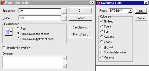 Переменные отчета задаются командой Report/Variables. В окне Report Variables имеются поля: Variables (список для ввода имен переменных), Value To Store (вводимое значение переменной), Intial Value (начальное значение переменной), Release After Report (удаление переменной после формирования отчета), Reset At (момент сброса переменной в начальное значение в конце отчета, страницы или группы), Calculate (групповая операция (рисунок 2.14.2.2)). Разметка листа отчета выполняется командой File/Page Setup. Окно Page Setup имеет поля: Number (число колонок на странице), Width (ширина колонок в сантиметрах или дюймах), Spacing (расстояние между колонками), Printable/Whole Page (поля страницы определяются драйвером печати/минимальные), Print Order (порядок вывода записей в многоколоночных отчетах), Left Margin (ширина левого поля отчета).