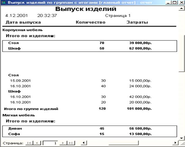 подчиненых. Допустим, в отчете выпуска изделий (п. 3.6.3) в заголовке группы “Наименование типа изделия” нужно вывести таблицу с итоговыми значениями числа выпущенных изделий и затрат на их производство по каждому наименованию изделия данного типа (подчиненный отчет), а затем вывести все изделия данного типа (рисунок 3.6.5.1). Рисунок 3.6.5.1. Окно предварительного просмотра составного отчета