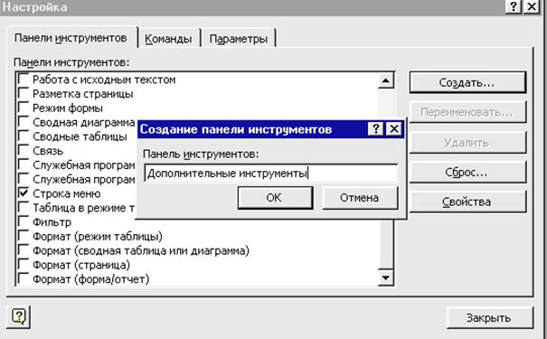 1. Выполним команду Сервис/Настройка/Панели инструментов/Создать. Укажем имя панели Меню (рисунок 3.7.1.1). 2.