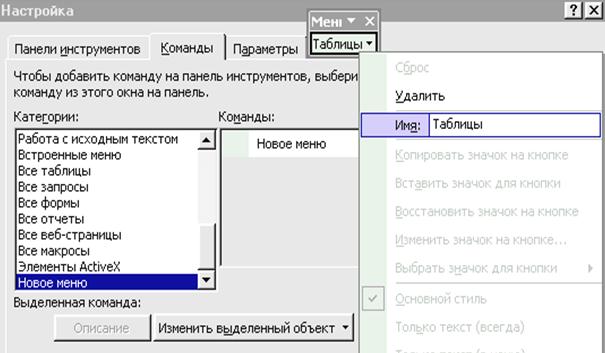 Перейдем на страницу Команды, выберем категорию Новое меню и команду из этой категории Новое меню, перенесем ее мышкой на панель Меню. Шелкнем правой кнопкой мышки по этому меню и в контекстном меню укажем наименование меню Таблицы (рисунок 3.7.2.2). Рисунок 3.7.2.2. Формирование меню с подменю “Таблицы” 3. Выберем категорию Все таблицы и перенесем все таблицы из списка команд данной категории в подменю Таблицы*. 4. Аналогичным образом сформируем остальные подменю: запросы, формы, отчеты. 5. В конце меню разместим опцию меню Выход с командой Выход из категории Файл. 6. Перейдем на страницу Панели инструментов, выделим нашу панель Меню и нажмем кнопку Свойства. Установим тип панели Строка меню (рисунок 3.7.2.3).