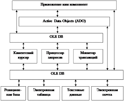 Обычно доступ производится через объект ADO, который упрощает работу с OLE DB [2, 3, 5]. Описание связи с источником может храниться в UDL‑файле связей (universal data link) или в проекте Microsoft Access.
