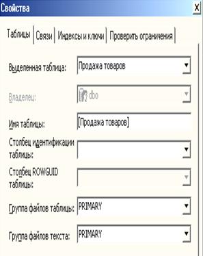 Свойства таблицы могут быть изменены в окне Свойства, вызываемого кнопкой Свойства таблицы свойств полей. Это окно состоит из четырех страниц: Таблицы (рисунок 3.12.4.2.2), Связи (рисунок 3.12.4.2.3), Индексы и ключи (рисунок 3.12.4.2.4), Проверить ограничения (рисунок 3.12.4.2.5).