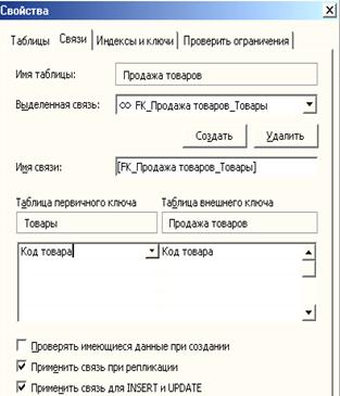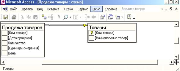 Схем базы данных может быть несколько (в отличие от одной схемы данных в базах данных Access). Работа с конструкторами схем и схемы данных Access в общем аналогичны (рисунок 3.12.4.3.1). Рисунок 3.12.4.3.1. Схема данных для базы данных “Продажа товаров” Командой Новая таблица (New Table) из контекстного меню конструктора схем можно создать таблицу. Командой Свойства столбца из контекстного меню таблицы в окне схемы можно изменить свойства таблицы (рисунок 3.12.4.2.1). Связь между двумя таблицами устанавливается путем перемещения указателем мышки при нажатой левой кнопке поля связи одной таблицы на поле связи другой таблицы с последующим выводом окна установки связи (рисунок 3.12.4.2.2). Используя контекстное меню схемы, можно изменить формы и расположение объектов на схеме. Командой Новое название контекcтного меню можно создать комментарий к схеме.