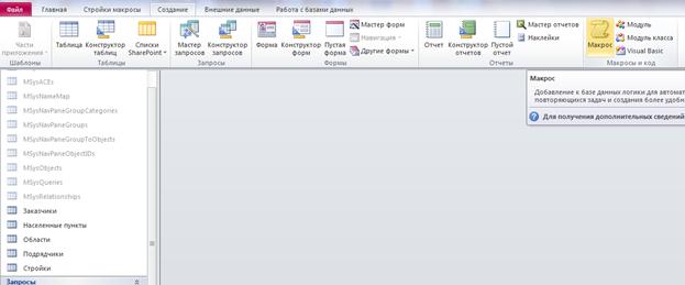 1) Открыть свою базу данных MS Access. 2) На рабочей ленте открыть вкладку {Создание} и выбрать пункт {Макрос} (рисунок 3.18.2.1).