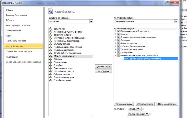 11) В конце нажимаем кнопку {Ок} под окном и может в деле использовать в ленте собственную вкладку содержащую ваши макросы. Стоит помнить о том, что в 2010 версии Access настройки ленты сохраняются на версии Access компьютера или в файле экспорта, и изменение ленты влияет именно на версию Access, а не на файл базы данных! Таким образом, настройку ленты пользователя не имеет смысла производить, если вам нужно создать ленту пользователя для конкретного приложения! В этом случае, ее нужно создавать новую ленту пользователя [п. 3.17.19].