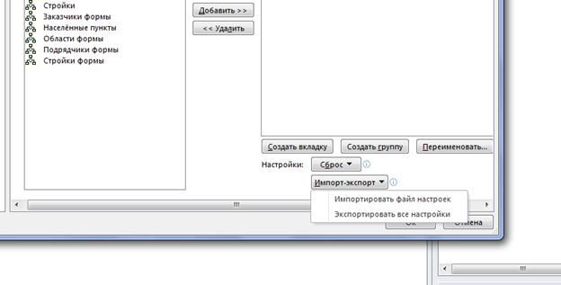 10) Для загрузки и сохранения настроек макросов используется кнопка {Импорт-экспорт}. Импорт открывает существующий файл настроек макросов и ленты, а экспорт сохраняет его.