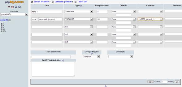 4. заполнить поля таблицы Field (название таблицы) Type (тип данных) Length/Values (Размер поля) Для текстовых полей во вкладке Collation выбрать cp1251_general_ci