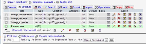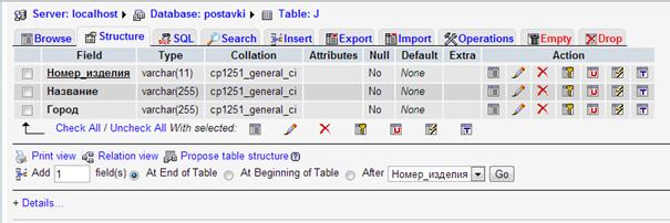 Создать таблицу 1. Перейти на вкладка Structure (Database:postavki) 2. В нижней части экрана Create new table on database postavki в поле Name ввести название таблицы, в поле Number of fields ввести кол-во полей таблицы 3. Нажать кнопку Go