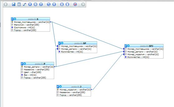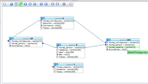 Установить связи таблиц 1. Перейти на вкладка Designer (Database:postavki) 2. Нажмите на стрелочку и выберете те таблицы которые необходимо