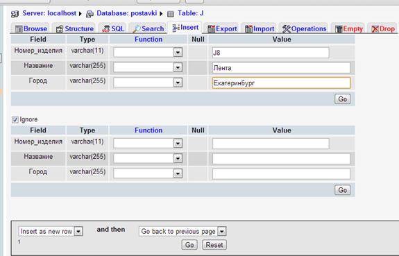 Для заполнения таблиц необходимо 1. Перейти на вкладка Insert (Database:postavki→Table:J)
