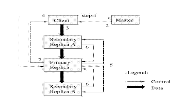 1. Клиент спрашивает мастера, какой из чанк-серверов владеет чанком, и где находится этот чанк в других репликах. Если необходимо, то мастер отдает чанк кому-то во владение. 2. Мастер в ответ выдает первичную реплику, и остальные (вторичные) реплики. Клиент хранит эти данные для дальнейших действий. Теперь, общение с мастером клиенту может понадобиться только, если первичная реплика станет недоступной. 3. Далее клиент отсылает данные во все реплики. Он может это делать в произвольном порядке. Каждый чанк-сервер будет их хранить в специальном буфере, пока они не понадобятся или не устареют. 4. Когда все реплики примут эти данные, клиент посылает запрос на запись первичной реплике. В этом запросе содержатся идентификация данных, которые были посланы в шаге 3. Теперь первичная реплика устанавливает порядок, в котором должны выполняться все изменения, которые она получила, возможно от нескольких клиентов параллельно. И затем, выполняет эти изменения локально в этом определенном порядке. 5. Первичная реплика пересылает запрос на запись всем вторичным репликам. Каждая вторичная реплика выполняет эти изменения в порядке, определенном первичной репликой. 6. Вторичные реплики рапортуют об успешном выполнении этих операций. 7. Первичная реплика шлет ответ клиенту. Любые ошибки, возникшие в какой-либо реплике, также отсылаются клиенту. Если ошибка возникла при записи в первичной реплике, то и запись во вторичные реплики не происходит, иначе запись произошла в первичной реплике, и подмножестве вторичных. В этом случае клиент обрабатывает ошибку и решает, что ему дальше с ней делать. Из примера выше видно, что создатели разделили поток данных и поток управления. Если поток управления идет только в первичную реплику, то поток данных идет во все реплики. Это сделано, чтобы избежать создания узких мест в сети, а взамен широко использовать пропускную способность каждой машины. Так же, чтобы избежать узких мест и перегруженных связей, используется схема передачи ближайшему соседу по сетевой топологии. Допустим, что клиент передает данные чанк-серверам S1,..., S4. Клиент шлет ближайшему серверу данные, пусть S1. Он далее пересылает ближайшему серверу, пусть будет S2. Далее S2 пересылает их ближайшему S3 или S4, и так далее. Обычно, при записи каких-то данных в файл, мы указываем эти данные и смещение. Если несколько клиентов производят подобную операцию, то эти операции нельзя переставлять местами (это может привести к некорректной работе). Если же мы просто хотим дописать данные в файл, то в этом случае мы указываем только сами данные. GFS добавит их атомарной операцией. Вообще говоря, если операция не выполнилась на одной из вторичных реплик, то GFS, вернет ошибку, а данные будут на разных репликах различны.
