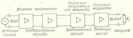 Каскад дает одну ступень усиления. Обычно это недостаточно и появляется необходимость использовать в усилителе ряд каскадов, последовательно усиливающих сигнал. Структурная схема усилителя в целом имеет вид: