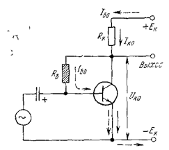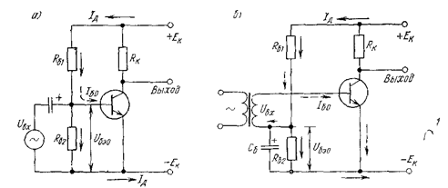 Это показывает, что напряжение смещения не зависит от тока коллектора и действительно является фиксированным. При этом ток коллектора не стабилизируется, а исходный режим с изменением температуры нарушается. Для обеспечения фиксированного напряжения Uбэо сопротивление нижнего плеча делителя Rб2 должно быть много меньше входного сопротивления транзистора, но это уменьшает общее входное сопротивление каскада, а это нежелательно. Чтобы избежать этого, иногда напряжение смещение во входную цепь подают последовательно с сигналом (рис 25б).