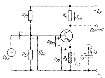 2. Автоматическое смещение зависит от тока покоя коллектора, при этом с изменением тока коллектора по любой причине смещение изменяется так, что ток коллектора стабилизируется. Таким образом, стабилизируется исходный режим выходной цепи. Для этого используется ООС по постоянному току. Одновременно с подачей смещения необходимо обеспечить стабилизацию режима, видов стабилизации несколько: