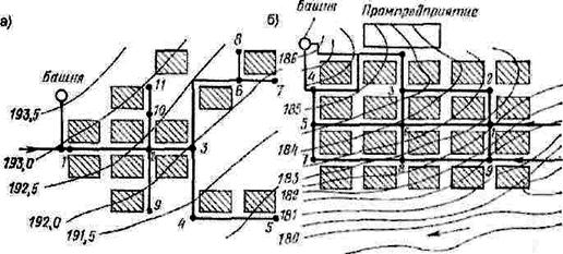 Водопроводная сеть Начертание в плане водоводов и водопроводной сети определяется · взаимным расположением источника и объекта водоснабжения, · планировкой застройки, · рельефом местности, · грунтовыми условиями, · наличием искусственных и естественных препятствий, · требованиями к обеспечению бесперебойного снабжения водой потребителей, · кратчайшими путями транспортирования воды. Взаимная увязка перечисленных требований и факторов осуществляется на первой стадии проектирования – трассирование сети. По конфигурации водопроводные сети бывают · тупиковые (разветвленные) (рис. 2.22, а), · кольцевые (рис. 2.22, б). Тупиковые сети не обеспечивают бесперебойности водоснабжения, поэтому они могут быть применены в тех случаях, когда по условиям потребления воды возможны перерывы в ее подаче на время, необходимое для ликвидации аварии, или когда существуют запасы воды для снабжения объекта на время восстановления трубопровода. Кольцевые сети. Благодаря наличию параллельно работающих линий, авария на любом участке не приводит к прекращению подачи воды потребителям, кроме питающихся непосредственно от поврежденного участка.