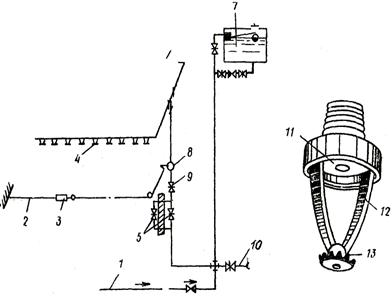 Рис. 3.24. Дренчерная полуавтоматическая система противопожарного водоснабжения: 1 – подача воды от основного водопитателя; 2 – трос; 3 – легкоплавкий замок; 4 – дренчеры; 5 – задвижки управления; 6 – распределительная сеть; 7 – водонапорный бак (автоматический водопитатель); 8 – клапан группового действия; 9 – главная задвижка; 10 – резервный водопитатель; 11 – корпус дренчера; 12 – рамка; 13 – розетка