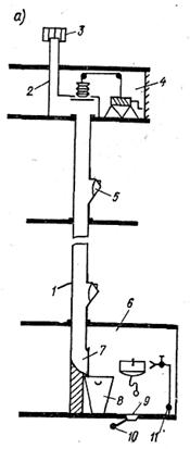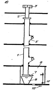 Рис. 5.19. Схемы холодных сухих мусоропроводов: (а – с верхней и нижней камерами (полная схема); б – упрощенная схема) 1 – ствол (шахта), 2 – вентиляционная труба, 3 – дефлектор, 4 – верхняя камера, 5 – приемный клапан, 6 – нижняя камера, 7 – бункер с шибером, 8 – мусоросборник, 9 – трап, 10 – канализация, 11 – холодный и горячий водопровод