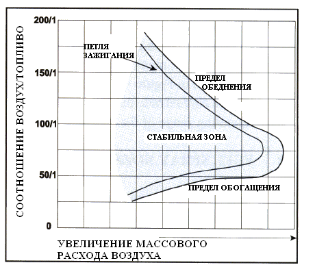 4.15. СТАБИЛЬНОСТЬ СГОРАНИЯ При нормальных условиях работы двигателя горение поддерживается самостоятельно. Система зажигания может быть эффективно отключена при наборе двигателем самоподдерживающейся частоты – частоты после запуска, при которой двигатель может разгоняться без помощи мотора стартера. Существуют определенные условия работы двигателя, для которых требуется зажигание, например, при срыве пламени – погасании пламени из-за различных ненормальных условий: при всасывании большого количества воды во время взлета с загрязненной ВПП. Другой причиной погасания пламени может служить слишком бедная смесь. Такая ситуация может возникнуть при сбрасывании газа во время снижения, когда возникает низкий расход топлива при большом расходе воздуха. Стабильность сгорания означает плавность горения и способность поддерживать его в широком диапазоне соотношений смеси и массовых расходов воздуха. На рис. 4.6 приведены ограничения по стабильности сгорания. Из графиков на рис. 4.6 видно, что стабильность сгорания будет достигаться только между границами, которые постоянно сужаются с увеличением массового расхода воздуха. Диапазон между пределами обогащения и обеднения уменьшается с увеличением массового расхода воздуха до определенной точки погасания пламени. Петля зажигания внутри границ зоны стабильность показывает, что инициировать горение сложнее, чем поддерживать его после зажигания. Из этого следует, что при срыве пламени в двигателе на высокой скорости или большой высоте может потребоваться уменьшение обоих параметров до получения успешного повторного зажигания.