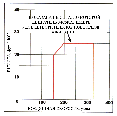 4.16. ПОВТОРНОЕ ЗАЖИГАНИЕ Как говорилось ранее, способность двигателя к повторному зажиганию будет меняться, в зависимости от высоты и поступательной воздушной скорости самолета. На рис. 4.7 показан смысловой диапазон повторного зажигания, отражающий условия полета, в которых будет гарантировано повторное зажигание работоспособного двигателя. Воздушный поток в двигателе будет вызывать его вращение (авторотацию), поэтому компрессор будет подавать достаточно воздуха, и требуется только открытие топливного крана ВД и активация системы зажигания. Это получается с помощью выбора переключателя повторного зажигания, который функционирует отдельно от нормального цикла запуска.