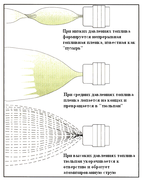 Рис. 4.9. Факелы распыла топлива при различных давлениях Хорошо видно, что отверстие фиксированного размера создает хороший факел распыла только при высоком давлении топлива. Для получения достаточной атомизации на запуске при низких давлениях топлива необходимо разработать определенные методы.
