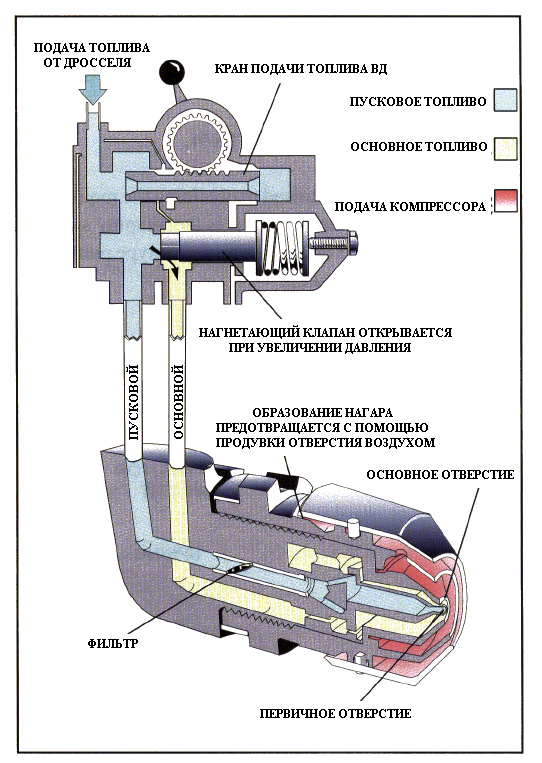4.19. СИСТЕМА ВОЗДУШНОГО РАСПЫЛЕНИЯ Одним из принципов получения требуемого факела распыла является дробление потока топлива высокоскоростным воздушным потоком – система воздушного распыления. Для этой системы требуются относительно низкие давления топлива, поэтому она может работать с использованием шестеренных насосов, которые намного легче и совершеннее плунжерных.
