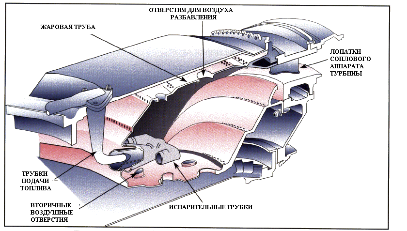 4.21. СИСТЕМА ИСПАРИТЕЛЬНЫХ ТРУБОК В испарительном методе, рис. 4.12, топливо из трубок подачи распыляется в испарительные трубки, находящиеся внутри жаровой трубы. Первичный воздух подается в жаровую трубу через отверстие в топливной трубке, а также через отверстия во входной секции жаровой трубы. Поток топлива разворачивается на 180 градусов, и, т.к. трубки подогреваются в процессе горения, топливо испаряется до попадания в жаровую трубу.