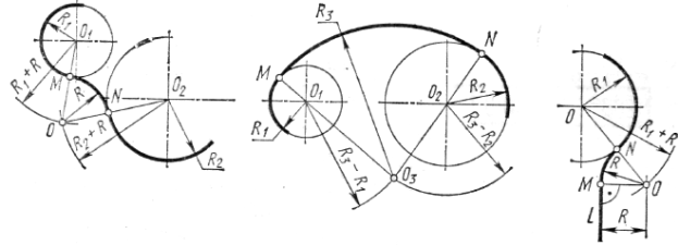 Рисунок 2 Внешнее сопряжение ( рис.3,а.). Сопрягаются две окружности. Их центры лежат вне сопрягающей окружности. Такое сопряжение называется внешним. Внутреннее сопряжение (рис. 3,б). Сопрягаются две окружности. Их центры лежат внутри сопрягающей окружности. Та кое сопряжение называется внутренним. Смешанное сопряжение (рис. 3,в) Сопрягаются две окружности. Центр одной окружности лежит вне сопрягающей окружности, центр другой окружности лежит внутри сопрягающей окружности. Такое сопряжение называется смешанным.