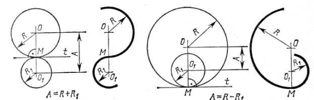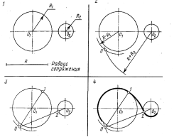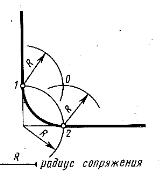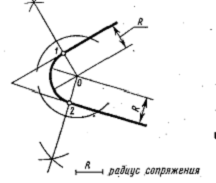 Бывает сопряжение одной прямой с другой прямой, прямой с кривой, одной кривой с другой кривой. Одна линия переходит в другую по дуге окружности. Эта дуга называется дугой сопрягающей окружности (рис. 2). Радиус этой окружности – радиус сопряжения. Центр этой окружности – центр сопряжения. Точка, где одна линия переходит в другую – точка сопряжения. Сопряжение прямой линии и окружности и сопряжение окружности с окружностью бывает внешнее, внутреннее, смешанное.