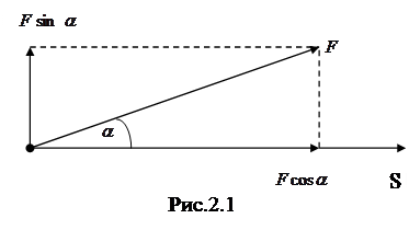 Пусть тело под действием постоянной силы совершило перемещение s (Рис.2.3). Перемещение тела обусловлено касательной составляющей силы Fcos Произведение движущей силы на перемещение называется работой:
